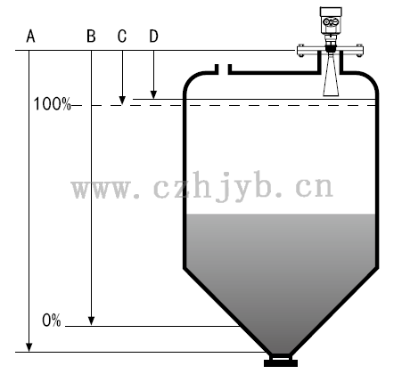 注:使用雷達物位計時,務必保證最高料位不能進入測量盲區(qū)(圖中D所示區(qū)域)。