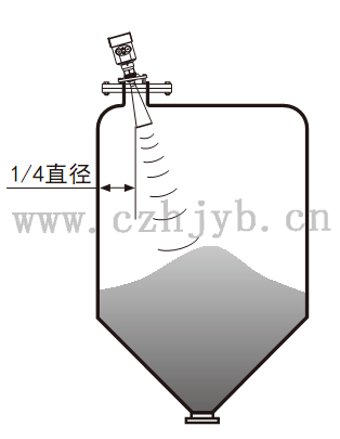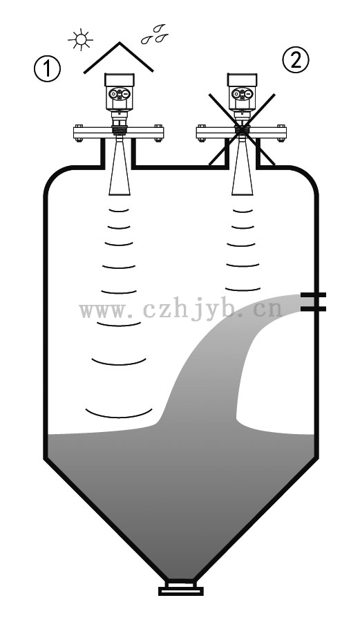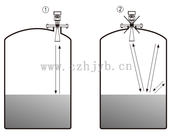 Ø 儀表不能安裝在拱形或圓形罐頂中間。除了會產生間接回波還會受到多次回波的影響。多次回波可能比真正回波的信號閥值還大,因為通過頂部可集中多個回波。所以不能安裝在中心位置。
