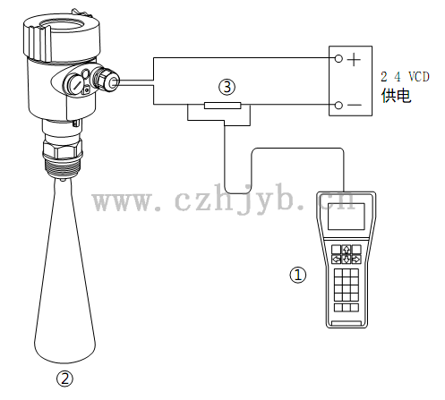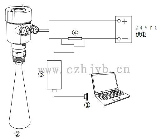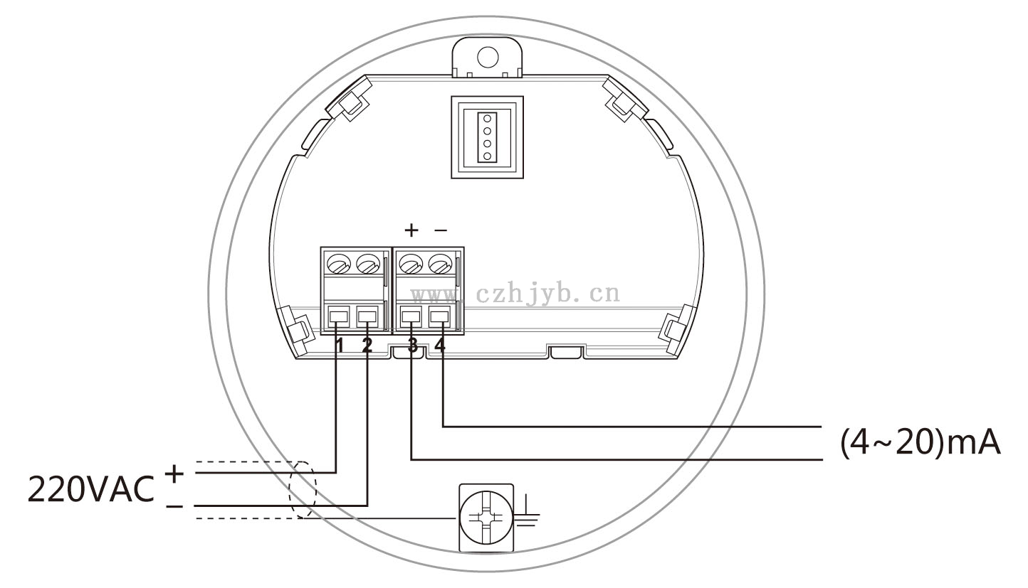 (4~20) mA/HART(兩線制) 供電電源和輸出電流信號共用一根兩芯屏蔽電纜線。具體供電電壓范圍參見技術數據。對于本安型須在供電電源與儀表之間加一個安全柵。