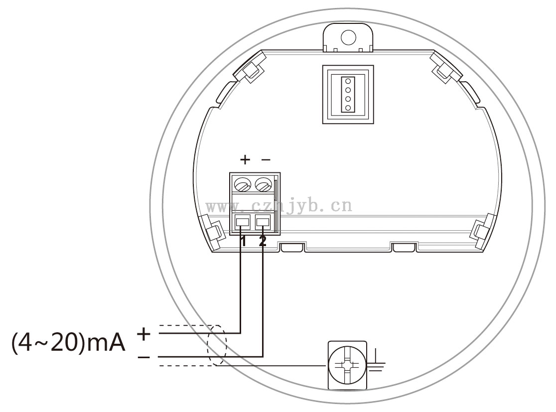 (4~20) mA/HART(兩線制) 供電電源和輸出電流信號共用一根兩芯屏蔽電纜線。具體供電電壓范圍參見技術數據。對于本安型須在供電電源與儀表之間加一個安全柵。